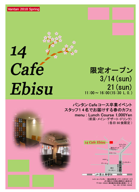 バンタンのカフェオーナーコースのスタッフ14名でカフェを二日間だけオープンします。 1年間の勉強で得た知識や技術を思う存分生かして、お客さんにおいしいひと時を過ごしてもらいたいです。 日時:2010年3月14日(日)、21日(日) 二日間限定 11時〜16時(15時30分ラストオーダー) 場所:レコールバンタンボヌール校(恵比寿校舎)1F (詳しくはポスターを見てください。) JR・東京メトロ 恵比寿駅から徒歩5分 東急東横