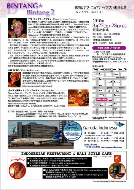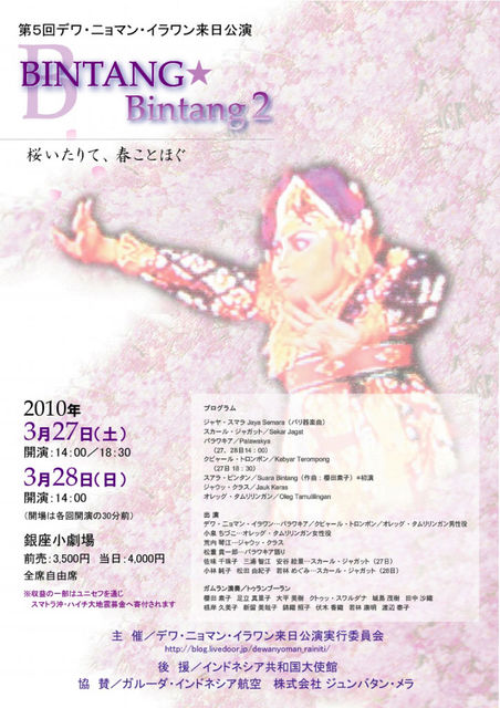 《桜いたりて、春ことほぐ》 日時:2010年3月27日(土)/14.00&18.00開演 2010年3月28日(日)/14.00開演 場所:銀座小劇場 料金:前売・3,500円 当日・4,000円 予約・問い合わせ:Tel:090-6459-9534(森しょうこ・来日公演実行委員会) Mail:ticket_bintang2@yahoo.co.jp