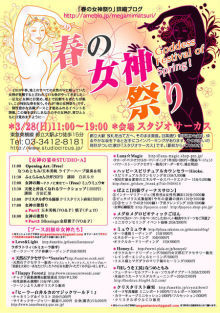 春の女神祭りとは? 2010年春。 地上のすべての女性の中に眠っていた女神が 覚醒すると言われている春がやってきました! 一足先に女神に目覚め、地上で活動する者たちが集い、 この特別な春を祝う。 それが「春の女神祭り」です 個性豊かな各種ブースと才能あふれるイベントを開催。 この場を訪れしあなたの中の女神が、喜びとともに目覚めますように。。 日時:2010年3月28日(日) 11時 OPEN 19時 CLOSE 場所:スタジオ サーカス(東横線都立大駅近く) http://www.studi