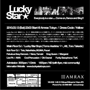 Lucky Star -Everybody is a star- 東京のハウスミュージックシーンを活発に活動する「Tomo Asahina (Fierce Angel Tokyo)」「Att (Citta Music)」と「Toru Takeda (Club-Rooty)」がお届けする、最高にPOPで楽しい空間。それがこの「Lucky Star」です。 Lucky Starとは一番星のこと。そして一番星は幸運をもたらす象徴です。 パーティ本来の姿に見られるPOPで楽しい音楽と空間、お洒落なファッションをこの一晩に詰め込みました。そしてぜひこの空間でしか出来ない「経験」と「出逢い」を見つけていただければ!との想いがパーティ名に込められ