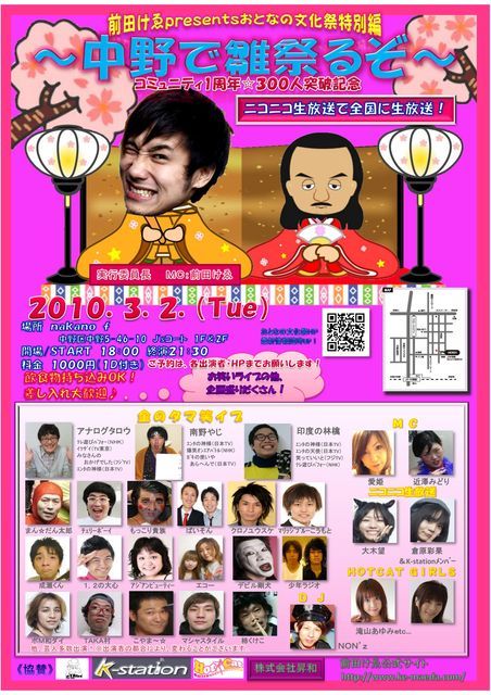 クロノユウスケ様ご出演イベントの告知です! 『前田けゑpresentsおとなの文化祭特別編〜中野で雛祭るぞ〜コミュニティ1周年☆300人突破記念』 2010年3月2日(火) 会場:nakano F 中野区中野5-46-10 J'sコート 1F&2F 開場/START 18:00(終演21:30) 料金:1000円/1ドリンク付き お酒、飲み物、食べ物持ち込みOK 差し入れ大歓迎 コミュニティ1周年と300人突破を記念して前田けゑが感謝祭という名のパーティーを開催いたします お笑い芸人
