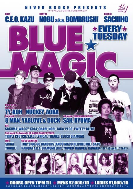 管理人様、告知失礼します。 本日の27destineyは毎週火曜日恒例のBlueMagicです! BLACK MUSIC、HIPHOP好きな皆様は是非今夜は27へ! ゲスト受け付けておりますので興味ある方は是非連絡下さい 2010.3.2(TUE)@27destiny BLUE MAGIC <HOST DJs> NOBU a.k.a. BOMBRUSH! SACHIHO <PICK UP DJ> TY-KOH <DJs> WASSY TWEETY BEERT PECO <MCs> SHINA <GOGO DANCERs> ANCO(TOKYO GOーGO DANCERS) MIE(TOKYO GO-GO DANCERS)