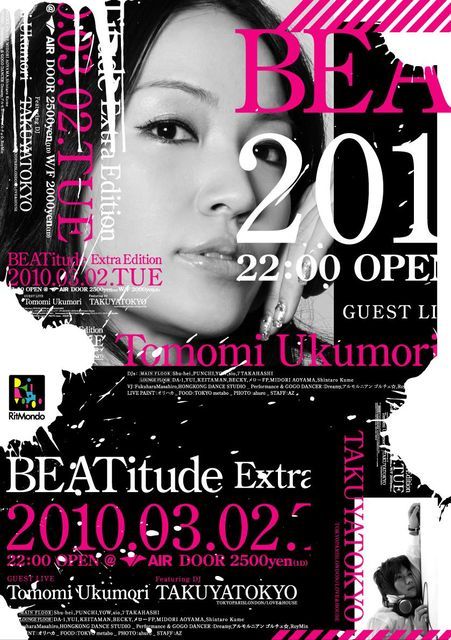 管理人様スペース失礼します。 興味あるかたがいらっしゃいましたら、私のほうまで連絡ください。 時期も場所も不定の神出鬼没パーティー『BEATitude』の番外編がいよいよAIRに登場!! 新進気鋭のDJ/VJ/PERFORMER陣からなるBEATitude Crewに加えて、2010年度NO.1ヒット確実のビッグタイトル"MEDITATION"をリリースしたばかりのTomomi UkumoriのGUEST LIVEと、LOVE&HOUSE 1st ALBUM"BRIGHTEST"に自身初のオリジナル楽曲を提供したTAKUYATOKYOをFEATURING DJとして迎えたこの一夜限りの宴は、無数にあるWEEKDAY PARTYに新たなムーブメントを起