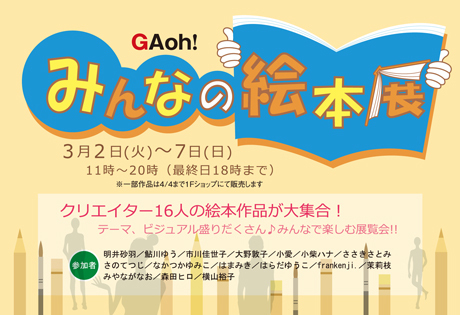 はじめまして。 下北沢にあるギャラリー GAoh! です。 3/2(火)から、16名の作家さんが作ったオリジナル絵本の グループ展を開催いたします。 下北沢にお越しの際には、ぜひお立ち寄りください! ★展覧会名 みんなの絵本展 ★概要 現在活躍中のクリエイター16名によるオリジナル絵本を展示・販売いたします。 テーマ・スタイルは自由なので、 各クリエイター毎に全く違ったテイストの絵本が楽しめます。 子どもから大人まで幅広く楽しめる展覧会です。 ★展示期間 2010年3月2日(火)〜7日(日) 11:00〜20:00(最終日18:00