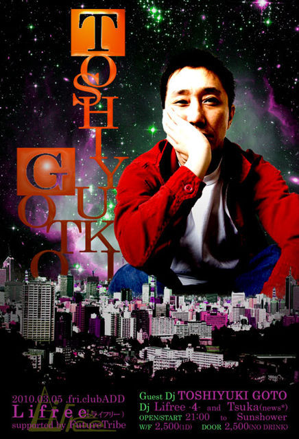 管理人様、告知失礼いたします。 「Lifree 」 supported by Future Tribe GUEST DJ TOSHIYUKI GOTO DJ:Kuniyoshi Saitoh Ryo Shirakabe Kondo Ken Watanabe OPEN 21:00 W/F 2,500YEN/1D,DOOR 2,500YEN/NO DRINK http://www.clubadd.com/ TOSHIYUKI GOTO 80 年代後期より、都内各クラブでDJ活動をスタートさせる。91年に突如単身渡米する。そして 94-96年の間、Party "Acme Disco"(NY)のDJとして活躍。同時に楽曲制作も積極的に行い、ジャズキーボーディスト菊池雅章氏とのコラボレーションユニット MATO名義での"Tribe" "Dr