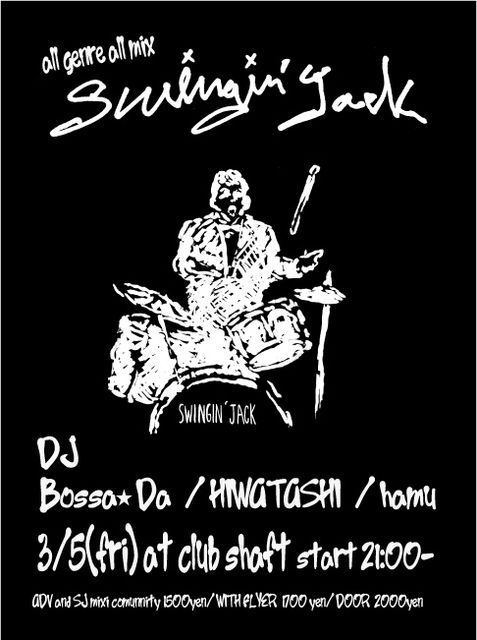 Swingin’ Jack今年最初のパーティーを約一ヶ月後やりますので、是非入らして下さい!今回はゲストなしの、ミツミが仕事で休みです〜。 先着30名様に架空のラジオ『踊るジャック君』最近のお気に入りの曲を2曲づつ紹介したCDをプレゼント! 2010.3.5.(fri) @CLUB SHAFT START 21:00〜All Night [ TICKET ] ADV \1500(1D) WITH FLYER \1700(1D) DOOR \2000(1D) □DJ Bossa★Da T.HIWATASHI hamu