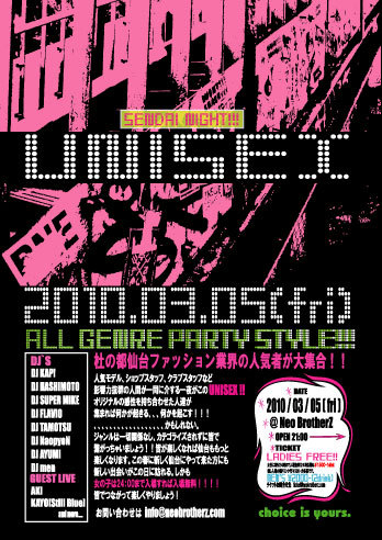 『UNISEX』 〜NEW EVENT〜 ALL GENRE PARTY STYLE 杜の都仙台、ファッション業界の人気者が大集合!! 仙台在住のモデル、ショップスタッフがDJをします。 ジャンルを問わない音楽とファッションで皆で輪を広げて人と人との繋がりを築きましょう!! この春仙台に来る人やオシャレを楽しみたい人は是非!! ■仙台Neo BrotherZ ■2010/3/5(fri) ■OPEN 21:00〜 ■TICKET men→\2000(2drink) ladies→〜24:00\FREE (1drink500) ※24:00〜¥1500(1drink) ■DJ KAP!/HASIMOTO/SUPER MIKE/FLAVIO/TAM