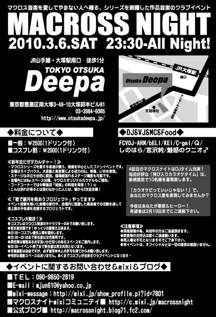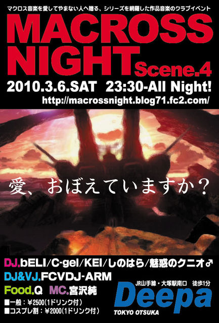 さてさて春のマクロスナイト、 「Pink Monsoon」と題した4回目の告知解禁です! 最大量のフライヤー配布でスタッフの気合も十分! 過去最高の盛り上がりを目指して一致団結奮闘します☆ 今回は「DJイベント」としての側面強めな内容でお届け。 好評のカラオケタイムは「新規のみ10名受付」とさせて頂きます。 まだ次回は誰でも参加OKにしますので、今回はごめんなさい。 DJイベントとしてスタートしたマクロスナイトの真髄をお楽しみに! ☆☆☆☆☆☆☆☆☆☆☆☆☆☆☆☆☆☆☆☆☆☆☆☆☆☆☆ ≪MACROSS NIGHT Scene.4 〜