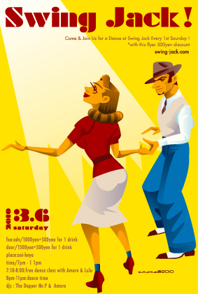 スイングジャック! 3月6日(土) 場所:青い部屋 http://www.asahi-net.or.jp/~nf3h-uen/mapbb.htm 料金:1500yen+500yen (for 1drink) 時間:7:00 open 7:10pm-8:00pm/フリーダンスレッスン with Amore & Lulu 8:00pm-11:00pm : DANCE TIME DJ:アモーレ guest dj :THE DAPPER MR.P スイングジャックはクラブイベントです。 お酒&ダンス&音楽を楽しみに来てください。 1920年代後半からハーレムで黒人達が踊っていた、 リンディーホップというダンスで楽しみます。 音楽もディキシーランドジャズ〜スイング〜ジャンプブルース〜