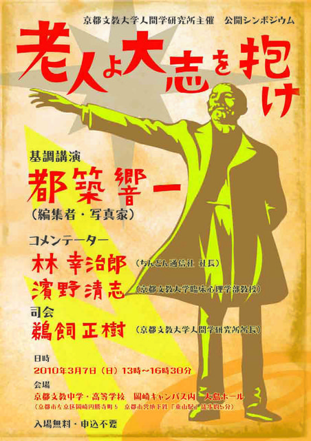 京都文教大学人間学研究所は、文化人類学科・現代社会学科・臨床心理学科という3つのユニークな学科からなる大学の、共同研究を推進する機関です。学際的な知的交流の場として、独自企画による公開講演会・シンポジウムなどを実施してまいりました。 今回は、編集者にして写真家の都築響一さんをお招きして、「老い」をテーマに語っていただきます。 基 調 講 演:都築 響一(編集者・写真家) パネリスト :林 幸治郎(ちんどん通信社社長) 濱野 清志(京都文教大学臨床心理学部教授) 司 会:鵜飼 正樹(京都文教