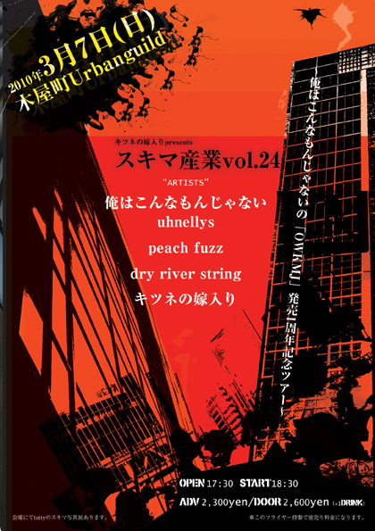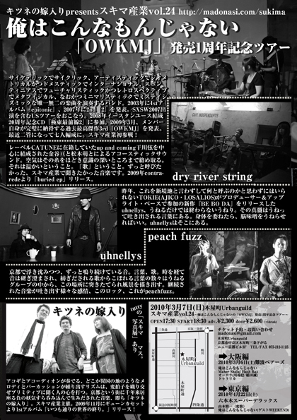 ■2010年3月7日(日)@木屋町Urbanguild スキマ産業vol.24〜俺はこんなもんじゃないの「OWKMJ」発売1周年記念ツアー〜 OPEN 17:30 START 18:30 adv.\2,300 door\2.600(+1drink) 出演 俺はこんなもんじゃない uhnellys peach fuzz dry river string キツネの嫁入り 【俺はこんなもんじゃない】 俺はこんなもんじゃない Profile サイケデリックでサイクリック、アーティスティックでジオメトリカルかつドメ スティックでインターナショナル、スポンティニアスでフューチャリスティック かつレトロスペクティブでメタ