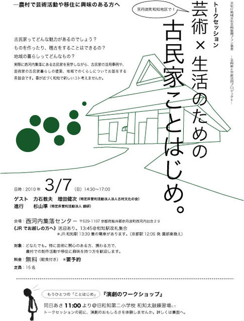 こんにちは、京都でこんなイベントを開催します。 お気軽にお越しください。 ーーーーーーーーーーーーーーーーーーーーーーーーーーーーーー トークセッション「芸術×生活のための、古民家ことはじめ」 ーーーーーーーーーーーーーーーーーーーーーーーーーーーーーー フライヤーダウンロード http://firestorage.jp/download/f434ce9fa7ef83e171d86f66f6c2d42ed88d3839 古民家ってどんな魅力があるのでしょう? 稽古やものを作ったりするには大丈夫? 地域の暮らしってどんなもの居住性は? 実際に西河内地区にある古民家を見