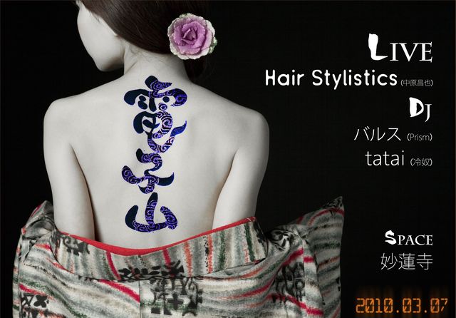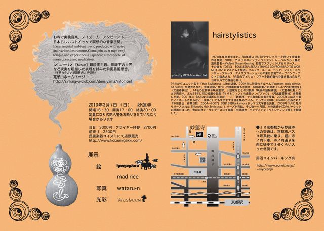 イベント告知させていただきます。 お寺で実験音楽、ノイズ、人、アンビエント。日本らしいストイックで瞑想的な音楽空間。 シュール【仏 Sur】 超現実主義。意識化の世界など現実を超越した表現を試みた前衛芸術思想。 (学研カタカナ新語辞典より引用) 公式ホームページ http://sinkaigyo-club.com/densiyama/info.html 2010 3/7 妙蓮寺 表書院 開場16:30 開演17:00 終演20:00 Sounds live Hair Stylistics (中原昌也) dj tatai (冷奴) バルス (prism)