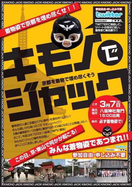 突然ですが… 『KIMONO で JACK』in 京都 開催します! 今回のターゲットは・・・ 「八坂ー清水」間に決定しました 15:00八坂神社南門に集合。 ゴールは清水寺仁王門。 その間に何かが起こりますよ! とにかく、15:00に八坂神社南門に着物で集合です! 参加表明無用です! 当日参加されても絡みません!たぶん・・・ 着物を着て、ゆる〜く集いましょうや もちろん、ご質問等は受け付けますのでお気軽に 主に(twitter)ツイッターでつぶやいてます。 当日も(twitter)ツ