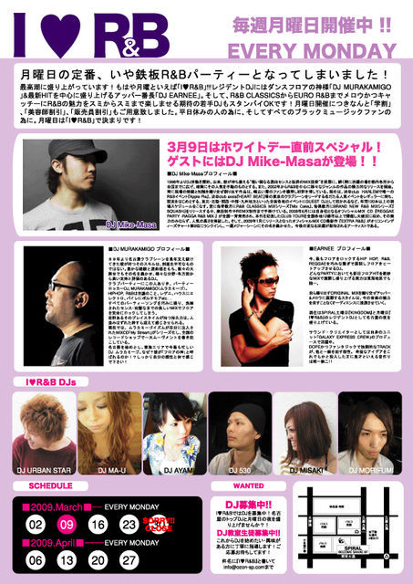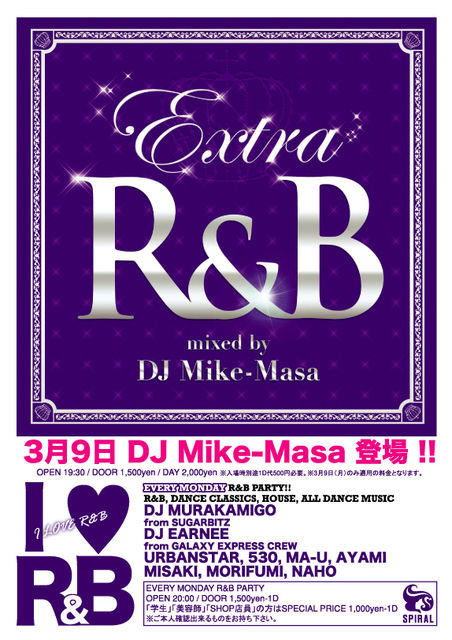 3月9日(月曜日)は「I R&B」はホワイトデー直前SP 現在2009年1月にリリースとなったオフィシャルMIX CD最新作 『 EXTRA R&B 』 がオリコンインディーズチャート第9位にランクイン。 一躍メジャーシーンにその名を轟かせている 『DJ Mike-Masa』が登場 何時もに増しての激上がりは必至 週末越えの月曜日へ是非遊びに来てください。 「I R&B」でみんなで盛り上がっちゃいましょう 【日時】3月9日月曜日 OPEN 19:30 【場所】名古屋SPIRAL 〒460-0008 名古屋市中区栄3-32-6 BECOME SAKAE