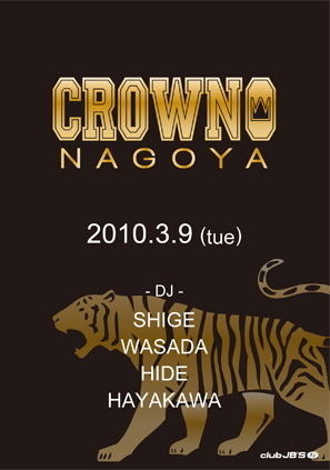 12月、1月、2月、3月の「4カ月チャレンジ」のいよいよラスト! 3月9日、club JB'SにてCROWNです。 前回2月は、基本フロアに人が多数な感じで、 ダンスミュージックパーティとしての形がばっちりと成功しました。 見知らぬおやじダンサーの方が熱いHOUSEダンスを踊ってくれてたのは、 かなりいい画でした。 で、結局、朝4時過ぎまで。。。 いつもより、絶対数は少し少なかったのに、 それでもフロアが人がたくさん集まるというのは、 なかなかウィークデーパーティでは見かけない光景なのです。 というわけで、3月9日! ※グレ