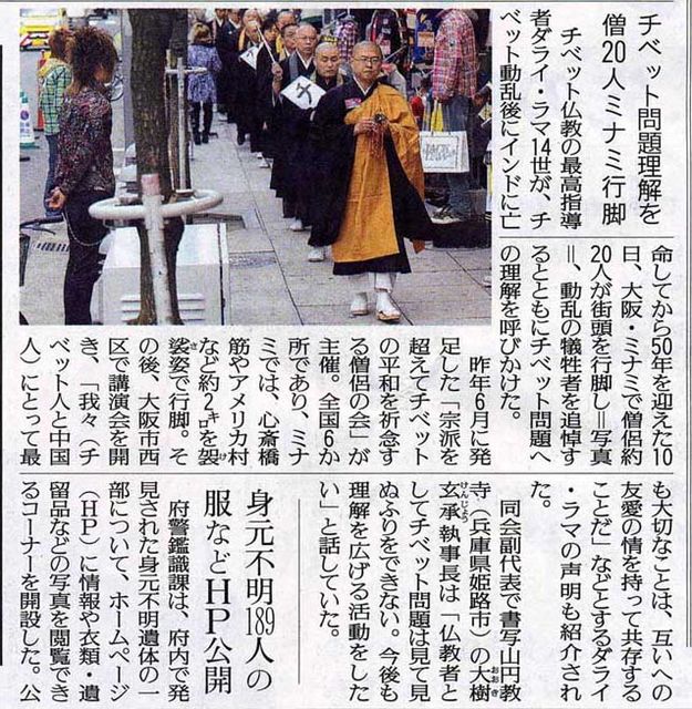 チベットを知り、祈ろう@大阪 ダライ・ラマ14世法王亡命51年 −平和を願う人々のために− 日時 3月10日(水) 16時〜 大阪ミナミ 行脚(あんぎゃ) 18時〜 チャクラ(北浜) 祈りの集い チベット問題は今、チベットと中国だけの問題としてではなく、普遍的人権や地下資源の乱掘、森林伐採、チベット高原に源を発しアジア大陸全域に深刻な影響を及ぼす大河川開発といった地球環境問題として、相互理解を積み上げながら共有し解決していくべき私たち人類の問題となっています。グ