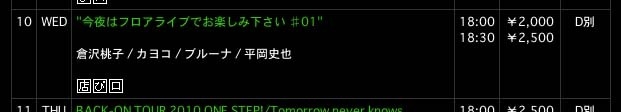 ■3月10日(水) OSAKA MUSE 〒542-0085 大阪市中央区心斎橋筋1丁目5-6 ミューズ389ビル 心斎橋筋商店街、周防町通を東へ一本目北に入る http://www.arm-live.com/muse/osaka/index.html "今夜はフロアライブでお楽しみ下さい ♯01" OPEN 18:00 / START 18:30 ADV \2,000(ドリンク別) 倉沢桃子 / カヨコ / ブルーナ / 平岡史也 ----------- さてさて明日はLiveです 弾き語り@OSAKA MUSE カヨコ出演時間は 19:40からになります 楽しみじゃ! お暇ありましたら是非 遊びに来てくださいまし チケット予約は、 ticket