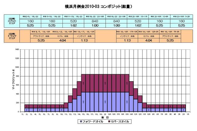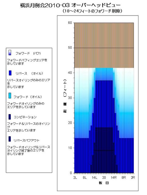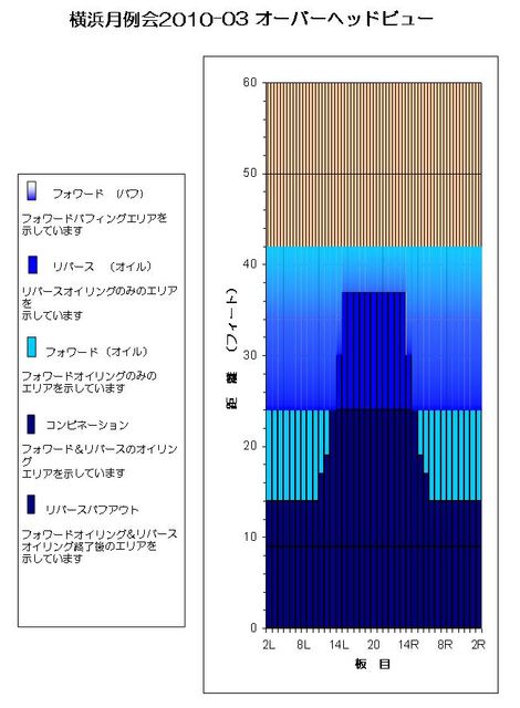 早いもので、もう3月 段々暖かくなってきてるし、ボウリング日よりな季節ですね ?? 36回目の月例会がやってきました。 ハイランドでスカッとしましょう!! 今回はオリジナルコンディションで、それもやや特殊なパター ンです。 インサイドにオイルが残り、外に甘さを残した、トーナメント の試合中盤を模擬しています。 オイリングのフォワードの設定は以下の通りです。 18フィートまで:インサイド(12枚より内) 18フィート以降:薄めのベタ 添付画像では、フォワード(行き)が24フィートまでオイリン グのベ