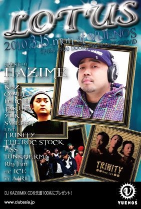 管理人様告知失礼します。 2010.3.15.Mon LOTUS@VUENOS TOKYO http://www.clubasia.co.jp/ OPEN 23:00 ☆GUEST DJ☆ HAZIME ☆DJ☆ KAZ CO-HEY DAICHI TAKUYA YUK1 SWEEET ☆LIVE☆ TRINITY THE ROC STOCK MSS JUNKQERMA Rhythm ☆MC☆ ICE ☆VJ☆ AIRI 毎月第三月曜に開催されている平日のBIGPARTY『LOTUS』 今回もGUEST DJはDJ HAZIME DJタイムにLIVEに一晩とおしてバッチリ楽しめます 毎回週末のような雰囲気と盛り上がりです 是非遊びに来て