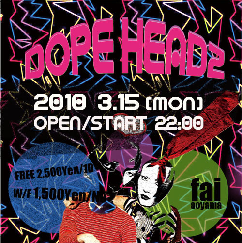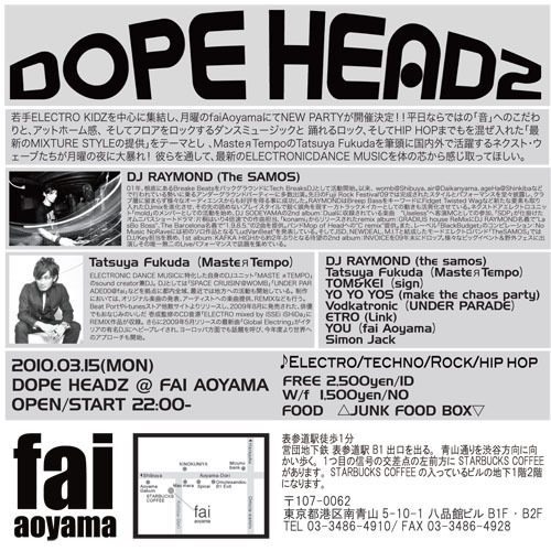 2月よりスタートしたばかりのNEW PARTY 【DoPE HEADz】!!!!!!! 毎月第3月曜日の開催!!!!!!!!!!!!!!! 今回、3月15日(月)はDJ RAYMOND(The samos)さんが、ゲスト出演します。 平日とは思えないほどの盛り上がりです。 一度、体感してみてください。 ディスカウントご希望の方は、名前(カタカナフルネーム)と人数をメッセージしてください。 お気軽に連絡くださいね。 【詳細】 2010.03.15(MON) DoPE HEADz@fai Aoyama OPEN 22:00- fee 2500/1D W/f1500/no Discount 1500/no