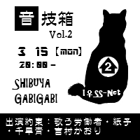 I♀SS-Net会進化型投銭ライブ 音技箱 vol.2 渋谷GABIGABI 共演:歌う労働者 紙子 吉村かおり(敬称略 50音順) 1ドリンクチケット500円 (500円以上のドリンクを飲まれる方は、ドリンクチケット+差額分を一緒にお支払い下さいますようお願い致します。) はーい、懲りずにやりますよ〜。 おとぎばこって読みます。 お時間あったらお越し下さいね☆ 千早青と一緒に飲みましょう〜! って・・・