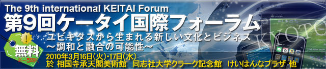 「第9回ケータイ国際フォーラム」公式サイトはこちら http://itbazaar-kyoto.com/forum/ -------------------------------------------------------------------- ●スケジュール● ※イベントは、原則無料でご参加いただけます!(一部除く) お気軽にお申し込みくださいませ! 【第1日目:相国寺承天閣美術館】3月16日(火) キーノートセッション 10:30-12:00 ■「ケータイと人の未来」 テレビやラジオでおなじみの先生方によるケータイ文化論。 ケータイは、人間の未来をどう変えるのでしょうか? http://itbazaar
