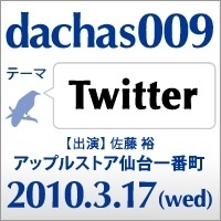 CSS Nite in SENDAIから派生した勉強会、dachas(ダッチャス)。 dachas009は「Twitter」をテーマに開催します。 CSS Nite in SENDAI実行委員会の佐藤裕が、Twitterの歴史、最近の動向・活用事例などをお話しします。 http://dachas.jp/009/ ※今回は無料イベントですが、人数を把握するためmixiではなく、 dachasのサイトより参加表明をお願いします。 お申込いただいた方にはフォローアップメールをお送りする予定です。 Twitter 最近様々なメディアで「Twitter」という言葉を見たり、聞いたりすることが多くなってきました。