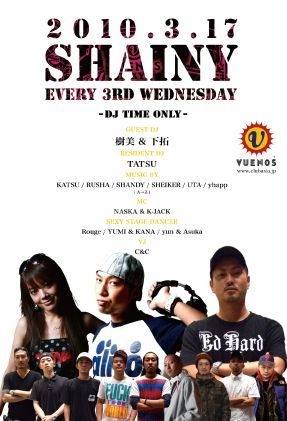 管理人様告知失礼致します!!! VUENOSでも数少ないDJ TIME ONLYのイベントといえばSHAINY 平日DJ TIME ONLYながら良質な雰囲気と毎月400人以上のPARTY PEOPLE達で人気爆発中 3周年目に突入しSHAINYはこれまで以上に皆様に愛されるPARTYを目指して参ります ゲストのDJ樹美、DJ下拓のPLAYはもちろん現場第一主義のDJ TATSUを中心にDJ SHEIKER、DJ RUSHA、DJ UTA、DJ SHANDY等のレギュラーDJ陣のPLAYも大注目 OPENからCLOSEまで本当に目がはなせません ステージを華やかに演出するSEXYなステージダンサー