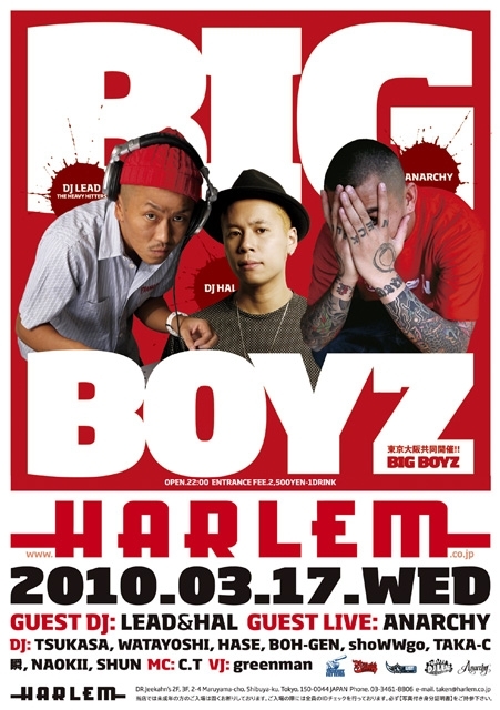 2010/3/17(wed) "BIG BOYZ" @HARLEM ゲスト料金で\1500/1Dになります 3月17日、新しいイベントがハーレムで誕生します!その名も”BIG BOYZ"!! 関西からは昨年Heavy Hittersにアジア人として初めて正式メンバーに選ばれたDJ LEADが、 関東からはHARLEMの金曜PUNCH OUT!!!を盛り上げるDJ HALが出演!! さらにはゲストライブとしてANARCHYも登場します! 当方は出演者になりますので、ゲストをお取りできます ゲスト入場を希望される方は、人数と代表者の方のお名前をコメントまたはメッセージしてください