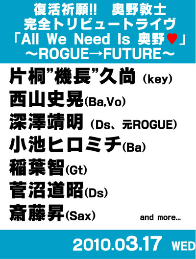 特別企画決定!!!! 2010/03/17 (水) at.高円寺ShowBoat 復活祈願!! 奥野敦士 完全トリビュートライヴ 「All We Need Is 奥野」 〜ROGUE→FUTURE〜 出演;片桐"機長"久尚(key) 西山史晃(Ba,Vo) 深澤靖明(Ds、元ROGUE) 小池ヒロミチ(Ba) 稲葉智(Gt) 菅沼道昭(Ds) 斎藤昇(Sax) open19:00 / start19:30 adv ¥4000 / door ¥4500 チケット発売:12/26 15:00〜ShowBoat店頭 (代引郵送・ご予約の受付の同時刻からとなります。) ※本公演は整理番号順のご入場になります※ http://www.showboat.co.jp/pick_