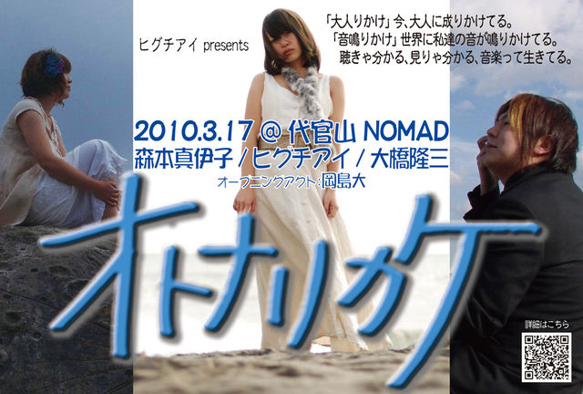 ヒグチアイ presents 『オトナリカケ』 2010.3.17 @ 代官山 NOMAD 大橋隆三 / ヒグチアイ / 森本真伊子 「大人りかけ」今、大人に成りかけてる。 「音鳴りかけ」世界に私達の音が鳴りかけてる。 聴きゃ分かる、見りゃ分かる、音楽って生きてる。 2010年3月17日(水) @ 代官山 NOMAD 東京都渋谷区猿楽町3-9 アベニューサイド代官山3F TEL/FAX 03-3770-3723 http://www.daikanyama-nomad.com/ Open:18:00 / Start:18:30 前売:¥2,000 / 当日:¥2,300(Drink別) 出演:[メインアクト]ヒグチアイ / 森本真伊子 / 大橋隆三 [