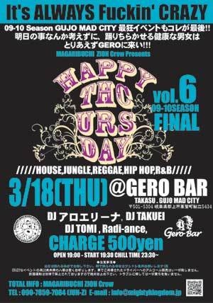 どうも。 ハレンチ木曜日のお知らせです。 奥美濃NO,1ハレンチNIGHTも今シーズンこれが最後! 前回はハレンチすぎて裸踊りがでるほどの盛り上がりとなりました。 篭り組みも地元組みも杭残すことなくたのしまんかな? 09-10 Season GUJO MAD CITY最狂ハレンチナイトもこれが最後!! 明日の事なんか考えずに、踊り散らかせる健康な男女は とりあえず、GEROにこい!!!!!! MAGARIBUCHI ZION Crew Presents 3/18 (木) HAPPY THURSDAY#6 09-10 Season FINAL!!!! @GERO BAR (TAKASU GUJO MAD CITY) 〒501-5304 岐阜県