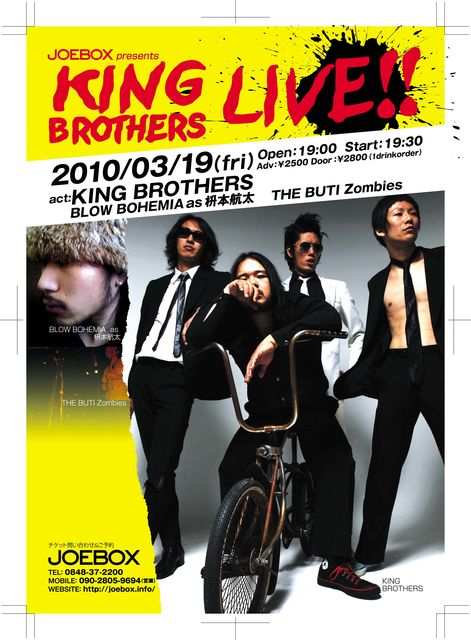 管理人様、失礼します。 西宮の狂犬KINGBROTHESが尾道初上陸です。 迎え撃つはモダンフォークロア枡本航太のソロプロジェクト BLOWBOHEMIAと尾道のパンクバンドTHE BUTI Zombiesです。 尾道市、初上陸のKING BROTHERSのライブに枡本航太asBLOWBOHEMIA が出演します! *********************** 出演 KING BROTHERS http://www.myspace.com/kingbrothersjapan BLOW BOHEMIA(枡本航太)http://www.myspace.com/masumotokota THE BUTI Zombies Open19:00 Start19:30 チケットadv\2500 door \2800(共
