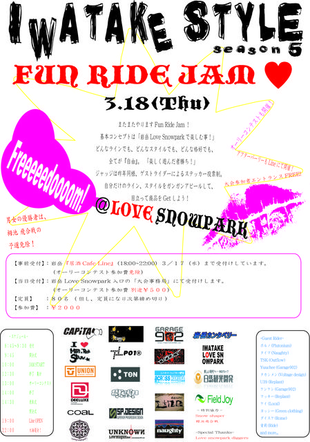 告知失礼します。 【3月18日(木)は白馬岩岳でスロープスタイルのジャムセッション!】 【IWATAKE STYLE 10 FUN RIDE JAM -SEASON5-】 今年で5年目を迎えた、岩岳の祭り、恒例大会イベントです。 「これから大会に出てみたい!」 「得意なトリックを見せたい!」 「友達とワイワイ楽しみながら参加したい!」 「祭りだ!」 「とにかく楽しむぜ!」 いいですねー! 出ちゃってみましょう! 結果はもとより、参加する事で自分のレベルや、足りない部分が見えてくる。 ゲストライダーも白馬ローカル