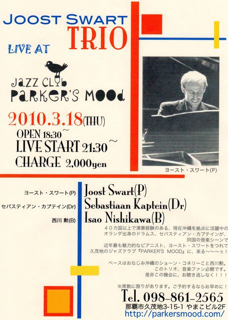 Piano: Joost Swart Bass: Isao Nishikawa / Drums: Sebastiaan kaptein open 18:30〜 [Live] 1st stage 21:30~, 2nd stage 23:00~ [Charge] 2000 yen [Place] Parker's Mood jazz club [Phone] 098 ・861・2565 小さいお店でテーブルに限りがございます。お早めにご予約ください。ご予約はinfo@parkersmood.comまで。