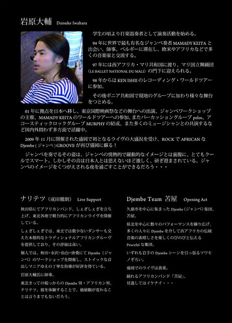 岩原大輔 ジャンベLIVE 2010.03.19(Fri) at 岩手盛岡 ni-ju(019-651-8885) http://www.northwing.net/gourmet/iwate/2005/05_02_01/index1.html Open : 20:30 Start : 21:00 Ticket:2300(1Drink) Live Support:ナリテツ(from秋田@しぇぎしぇぎ) Opening Act:Djembe Team 苫屋 (from久慈)