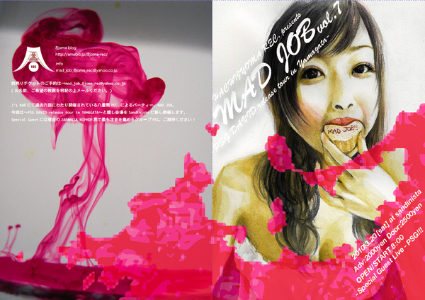 ---------------------------------- 八畳間REC. presents MAD JOB vol.7 〜PSG DAVID release tour in YAMAGATA〜 at SANDINISTA 2010.3.20(sat) adv:2000yen door:2500yen OPEN/START 8:00 -Special Guest Live- PSG(punpee / S.L.A.C.K. / GAPPER) -LIVE- NEON SKOOL ヒトツキ -DJ- AND(BAHANA) TAKAYOSHI(plus 1 more)[JAPANESE SET] CHIAKI(MAD JOB) OZA(MAD JOB/OPEN) 中村名人(MAD JOB) -LIVE PAINT- ぐんぽうさん tkM023 [PSG profile] 何だこのラップ!?」「何だこのトラック!?」「何だこのスキル!?」リ