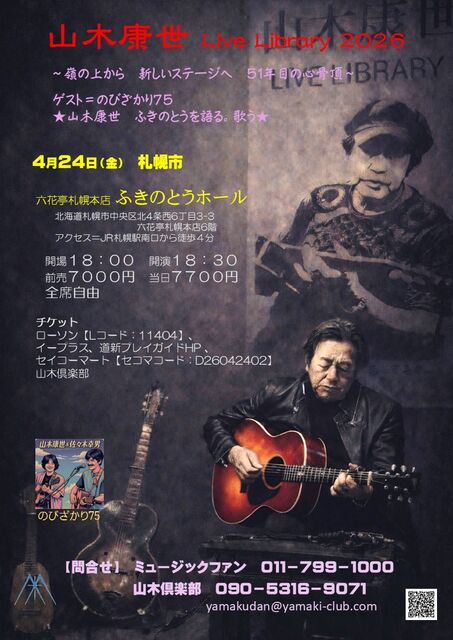 「山木康世 Live Library 2026」 〜嶺の上から 新しいステージへ 51年目の心骨頂〜 ゲスト=のびざかり75 ★山木康世 ふきのとうを語る。歌う★ 会場=ふきのとうホール 北海道札幌市中央区北4条西6丁目3-3 六花亭札幌本店6階 アクセス=JR札幌駅南口から徒歩4分 開場=18:00 開演=18:30 前売=7000円 当日=7700円 全席自由 チケット ローソン【Lコード:11404】 イープラス 道新プレイガイドHP https://doshin-playguide.jp/ticket/detail/1367 セイコーマート【セコマコード:D26042402】 山