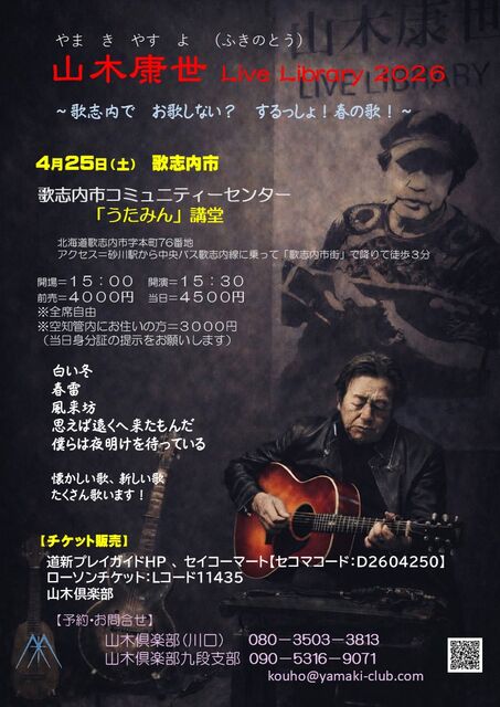 「山木康世 Live Library 2026」 〜歌志内で お歌しない? するっしょ!春の歌!〜 O.A. サドTOムロ 会場=歌志内市コミュニティーセンター「うたみん」講堂 北海道歌志内市字本町76番地 アクセス=砂川駅から中央バス歌志内線に乗って「歌志内市街」で降りて徒歩3分 開場=15:00 開演=15:30 前売=4000円 当日=4500円 ※空知管内にお住いの方=3000円(当日身分証の提示をお願いします) ※ドリンクはご持参ください。 チケット ローソン【Lコード:11435】 道新プレイガイドHP ht