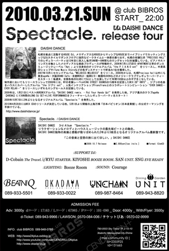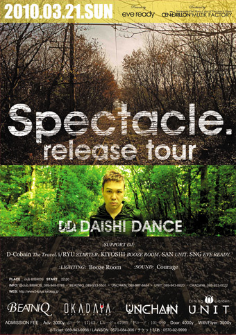 DAISHIDANCE 3rd Album "Spectacle" RELEASE PARTY. in MATSUYAMA -eve ready present's- 2010.03.21.SUN [振替休日前夜] PLACE: club BIBROS START 22:00 SPECIAL GUEST: DAISHI DANCE SUPPORT DJ: D-Cbain. i/RYU. KIYOSHI. SAN. SNG LIGHTING: Booze Room SOUND: Courage :ADMISSION FEE: Adv: 3000yen(dコード:17163 / Lコード:67985 / Pコード:101-090) Door: 4000yen With/Flyer: 3500yen [d-Ticket: 089-943-9966 / LAWSON: 0570-084-006 / チケットぴあ:0570-02-9999] ■Main Ticket Shop■ BEAT