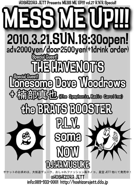 「MESS ME UP!!!vol.27」 BANDS ☆THE HAVENOT'S ☆Lonesome Dove Woodrows ★P.L.V. ★THE BRATS BOOSTER ★soma ★NOW DJ ハム助 ADV2000yen/door2500yen (1DRINK別) *横浜のロック番長THE HAVENOT'Sが、Lonesome Dove Woodrowsを引き連れて松山襲来! 今回、ロンサムのサポートドラムにはなんと、exニートビーツ、レディオキャロラインのクスベシンヤ氏! ご来場お待ちしてます〜!!!