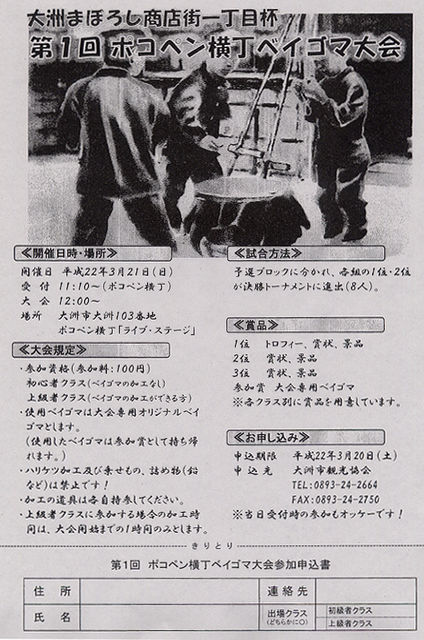 ジッとちじこまって耐えた冬もそろそろ終わり? (寒の戻りが来そうじゃが...) さて、ポコペン横丁は今年もいろんなイベントを企画して、 皆さんのお越しをお待ちしています。 まず、今月は21日(日)のポコペン祭り この日から11月末まで毎週日曜日に開催のポコペン横丁。 そのオープニングイベントとして、 大洲まぼろし商店街一丁目杯 第1回ポコペン横丁ベイゴマ大会 を、開催いたします。 《開催日時・場所》 開催日:平成22年3月21日(日) 受 付:AM11:00〜(ポコペン横丁)