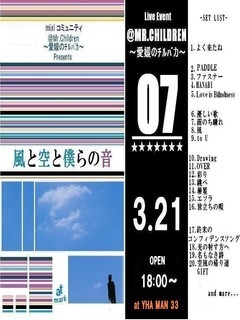 恒例になってる@PROJECT Presents 「@チルバカオフ&ライヴ♪」 ありがたいことに 毎回、かなりの反響を頂き、 回を増す毎に、いろいろな人の参加が増えい頂いてますので またまたコミュオフ会 全員主催者イベント開催しちゃいます 今回のテーマは 『風と空と僕らの音』 コミュニティ 『@Mr.Children〜愛媛のチルバカ』発 @PROJECT Presents @チルバカオフ&ライヴ7☆in大街道 『風と空と僕らの音』 3月21日(日曜日) 場所:愛媛県松山市 会場:YAH MAN 33 時間:18:00〜