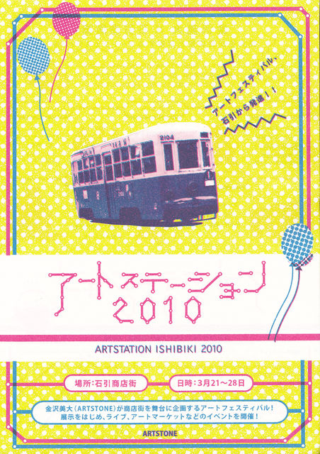 貴重なスペースお借りします。 ■アートステーション石引2010■ 石引商店街をアートの力で盛り上げるイベントです! 商店街のお店や空き店舗で美大生が展示を行います 限定メニューの販売やアートマーケット、ライブもあります みなさんお誘いあわせの上是非お越し下さい! -------------------------------------------------------- ○詳細 期間:2010年3月21日(日)〜28日(日) 21、22日…オープング (22日にライブパフォーマンス、フリーマーケット) のっぽ下にて限定メニュ