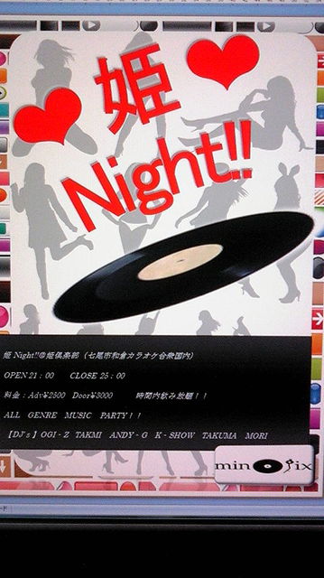 料金 Adv \2,500 door\3,000 なんと時間内飲み放題!! わーーい!! DJ's 21:00〜 G〔Drum&Bass〕 & OGI-Z〔House〕 22:00〜 TAKUMA〔HipHop〕 22:40〜 TAKMI 〔House〕 23:20〜 K-SHOW〔Rock〕 24:00〜 MORI 〔Dub Funk〕 Last OGI-Z〔House〕 とりあえずこんな感じ!! 飲み放題!! 飲み放題!! やばいやばい!! 楽しみすぎる!! チケットは姫倶楽部もしくは… DJ`sに連絡してちょ。。。