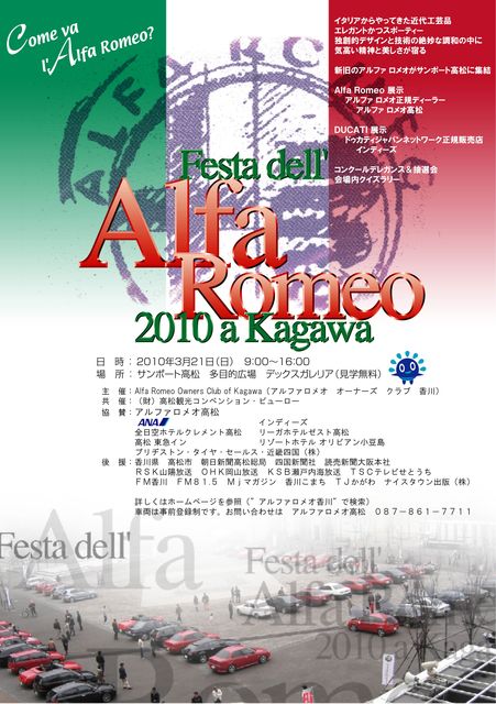 アルファロメオ・オーナー様同士のコミュニケーション、情報交換を目的とした手作りオーナーズミーティング”Festa dell'Alfa Romeo 2010 a Kagawa“を香川県高松市のサンポート高松で開催します。お話をするも良し、観光・散策をするも良し、さぬきうどんを食べに来るついででも良し。桜の開花も迫ろうとするドライブシーズンが到来する春。お気軽に参加してください。