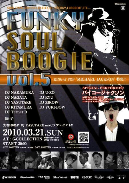 ☆FUNKY SOUL BOOGIE〜vol.5 2010/03/21(Sun)祭日前夜 20:00〜START "KING of POP" MICHEL JACKSON 特集!! ゲストダンサーに九州のマイケルジャクソン! モノマネの域ではないホンモノダンサー、バイクによるエンターテイメントショーは圧巻! ■Special PERFORMAER ・バイコージャクソン ■DJ's ・NAKAMURA ・NAGATA ・YASUTAKE ・U-ZO ・KITAMURA ・RYU ・ZIROW ・Terner-B ・YUKI-BOW ■DANCE SHOW ・扇 子 ★先着100名に DJ YASUTAKE 限定MIXCD プレゼント!! AT:G-COLLECTION 佐賀市中央本町1-24 前売:2,
