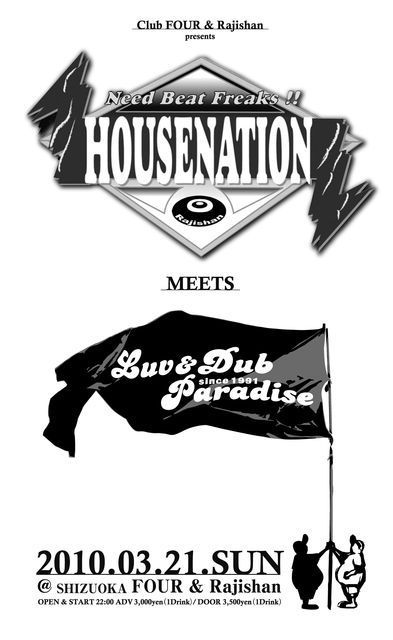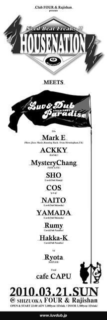 管理人様、告知失礼致します。 不適切でしたらお手数ですが削除お願い致します。 ※※※※※※※※※※※※※※※※※※※※※※※※※※※※※※ 2010.3.21(sun) HOUSENATION meets Luv&Dub Paradise @Rajishan & FOUR Open/22:00 Adv/\3,000(1d) Door/\3,500(1d) DJs @FOUR Mark E (Merc,Running Back/from Birmingham, UK) ACKKY(BANK!) MysteryChang(NITE LITE) Hakka-K(Luv&Dub Paradise since1991) @Rajishan DJ SHO(Luv&Dub Himeji) NAITO(Luv&Dub Shizuoka) COS(p.u.g) YAMADA(Luv&Dub