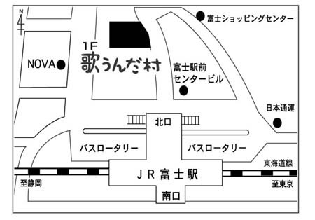 今回のオフ会は前回開催予定だったものの延期に なっていた物件ですので再度皆様にご案内させていただきます。 オフ会概要【03月18日時点】 開催日:2010年03月21日(日) 開催時間:13時〜13時半(集合)13時半〜18時頃(開催場所) 集合場所:富士駅北口 開催場所:歌うんだ村富士店(MAPは画像参照) 〒416-0914 静岡県富士市本町4-11 平和本町ビル1階 (URL→http://search.daisyo.co.jp/shop.php?shop_cd=1498) 参加費:カラオケ代880円程 (5時間パックドリンクバー+ポップコーン食べ放題) というわけで、今回は県東部での開催